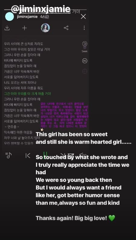 그는 "지민이가 쓴 글에 정말 감동받았다. 우리가 함께 보냈던 시간들에 진심으로 감사하다"며 "그 때 우리는 너무 어렸지만 나는 항상 지민이 같은 친구를 원했다. 지민이는 유머러스하고, 유쾌하고, 친절했다"고 말했다.