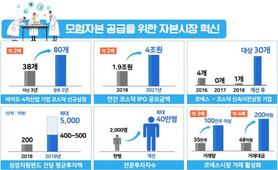 21일 금융위원회는 '혁신금융 비전선포식'을 통해 코스닥·코넥스시장 활성화 정책을 내놨다. 금융위는 3년 뒤 실현할 3대 정책목표로 ▲바이오·4차혁명 기업 80곳 코스닥상장 ▲혁신 중소?중견기업에 100조원 규모 자금 공급 ▲7만개 주력산업·서비스기업 사업재편 지원 및 17만명 고용창출 등을 제시했다.