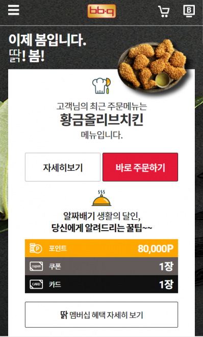 포인트 적립은 모바일과 비비큐 홈페이지에서 모두 가능하며 타사 채널을 통한 주문은 적립대상이 아니다. 또한 할인 프로모션 기간에는 포인트가 중복 적립되지 않는다.