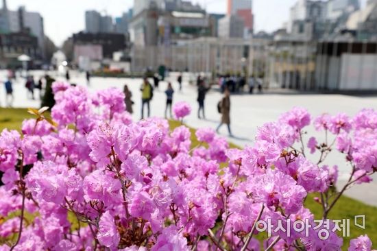 포근한 봄 날씨를 보인 29일 진달래꽃이 만개한 서울 서대문구 이화여자대학교에서 시민들이 산책을 하고 있다. /문호남 기자 munonam@