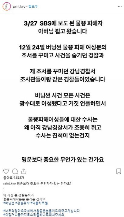 지난달 31일 '버닝썬 사태' 최초 고발자 김상교 씨가 자신의 인스타그램을 통해 '경찰유착' 조사를 재차 촉구했다/사진=김상교씨 인스타그램 캡처