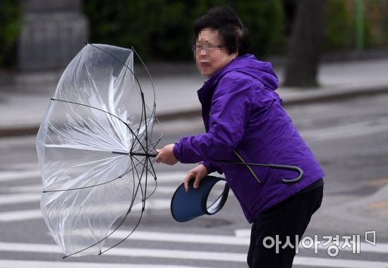 전국적인 봄비가 예보된 9일 서울 광화문 인근에서 한 시민의 우산이 강한 바람에 뒤집히고 있다. 기상청 관계자는 "전남 해안과 제주도에 비가 내리고 있으며 오후에는 충청도와 남부지방, 밤에는 전국으로 확대될 것"이라며 "10일 오전까지 전국 대부분 지역에 비가 내릴 전망"이라고 예상했다./김현민 기자 kimhyun81@