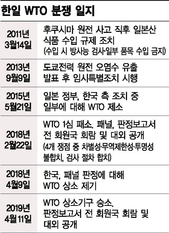 12일 윤창렬 국무조정실 사회조정실장은 "WTO 상소기구는 1심 당시 일본 측이 제기한 차별성ㆍ무역제한성ㆍ투명성ㆍ검사절차 등 4대 쟁점 중 투명성 공표의무를 제외한 사실상 모든 쟁점에서 1심 패널 판정을 파기했다"며 "WTO 위생 및 식물위생(SPS) 협정분쟁에서 1심(패널) 판정이 2심에서 뒤집어지거나 피소국이 이긴 사례는 이번이 처음"이라고 말했다.