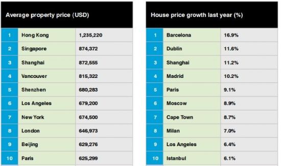 전년 대비 평균 집값 상승폭이 가장 높은 도시는 스페인 바르셀로나로 1년 만에 무려 16.9% 껑충 뛰었다. 아일랜드 더블린(11.6%), 중국 상하이(11.2%), 스페인 마드리드(10.9%)도 두 자릿수 상승률을 기록했다. 반면 아랍에미리트 아부다비(-10.0%), 두바이(-5.3%), 리야드(-4.4%) 등은 집값이 오히려 떨어졌다.
