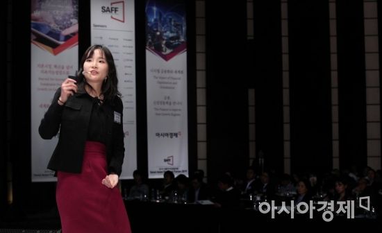 정선재 뱅크샐러드 PMO가 17일 서울 중구 소공로 웨스틴 조선호텔 그랜드볼룸에서 아시아경제 주최로 열린 '2019 서울아시아금융포럼(SAFF 2019)'에서 강연하고 있다./김현민 기자 kimhyun81@