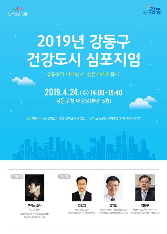[아시아경제 박종일 기자] 미세먼지가 건강과 일상을 위협하는 국가 재난으로 떠오른 가운데 강동구(구청장 이정훈)가 24일 오후 2시 구청 5층 대강당에서 ‘미세먼지, 전문가에게 묻다’라는 주제로 건강도시 심포지엄을 개최한다.