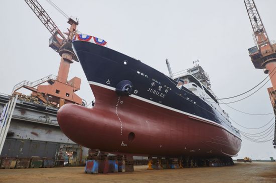 23일 관련 업계에 따르면 동원산업은 5~6월경 최신형 선망선의 진수식을 갖을 계획이다. 진수(進水)란 새로 만든 선박을 처음으로 물에 띄우는 것으로, 진수식은 배의 탄생을 축하하는 의미의 행사다. 앞서 지난 3월엔 최신형 선망선인 '주빌리'호의 진수식을 열었다. 2200t급 헬기탑재식 최신형 선망선으로, 영하 18도 브라인(소금물)을 활용한 급랭설비를 통해 통조림용 참치 뿐만 아니라, 고부가가치의 횟감용 참치까지 생산할 수 있다.