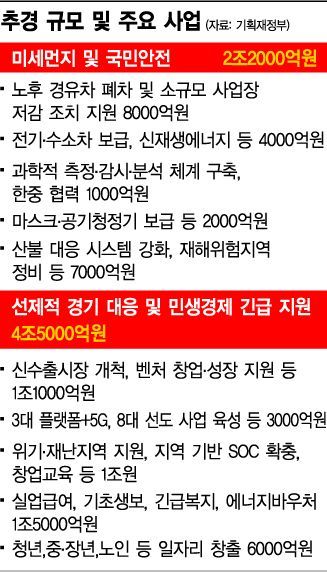 [아시아경제 최일권 기자, 김민영 기자] 정부가 24일 발표한 올해 추가경정예산(추경)안은 규모만 놓고 보면 미세먼지(1조5000억원)보다는 경기 대응(4조5000억원)에 방점이 찍혔다. 올해 들어 예상보다 수출 감소 속도가 빨라지면서 경기 둔화 우려가 커지고 있다는 위기의식이 반영됐다는 게 기획재정부의 설명이다.