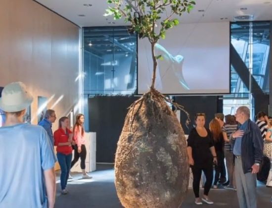 전시관에 전시된 '캡슐라문디'를 살펴보는 사람들. 묘목 아래에 타원형의 캡슐이 달려있고, 그 속에 시신이 태아 상태의 모습으로 안치됩니다. [사진=유튜브 화면캡처]