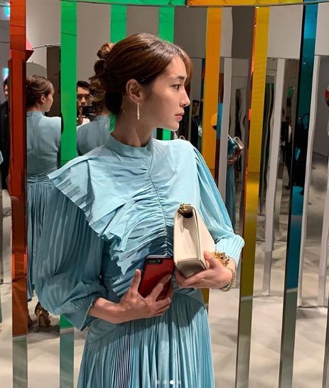 이민정은 최근 자신의 인스타그램에 몇 장의 사진을 올렸다. 하늘색의 주름이 인상적인 드레스를 입은 모습에서 우아함이 느껴진다.