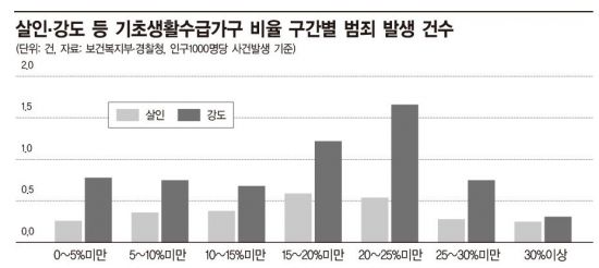 연구에 따르면 빈곤층 비율이 높은 지역에서는 오히려 범죄 발생률이 낮게 나타났다. 2007년부터 2016년까지 최근 10년간 5대 범죄 유형별(살인, 강도, 강간ㆍ강제추행, 절도, 폭력) 발생건수는 기초생활수급가구 비율이 0~5%인 구간부터 점점 올라가 10~15% 구간에서 가장 높아졌다. 하지만 20~25% 구간부터는 오히려 줄어드는 경향을 보였다. 인구 1000명당 살인 발생 건수를 백분율로 계산해보니, 기초생활수급가구 비율 0~5% 구간(0.26건), 5~10%구간(0.36), 10~15%(0.38), 15~20%( 0.59)까지 올라가지만 이후 20~25%(0.54) 25~30%(0.28) 30% 이상(0.25)으로 낮아졌다. 즉 빈곤층이 특정 지역에서 많이 거주할 수록 범죄율이 높아지지만, 일정 수준 이상으로 많아지면 오히려 줄어드는 추세가 관찰된 것이다.