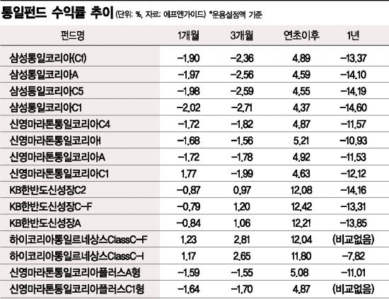 8일 금융정보업체 에프앤가이드에 따르면 전날 기준으로 설정액 10억원 이상인 펀드 중 펀드 명칭에 '통일'이나 '한반도'가 포함된 남북 경협 관련 펀드 15종의 최근 3개월 평균 수익률은 -0.8%를 기록했다. 연초 이후 수익률로 따져봤을 때는 평균 7.2%로 수익권이다. 올 1월까지만 해도 남ㆍ북정상회담, 북ㆍ미정상회담에 대해 거는 기대감이 커 올 한해 동안 꾸준히 수익률이 높아질 것이라는 전망이 우세했기 때문이다.