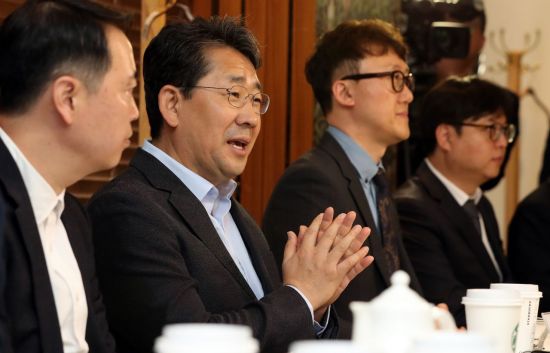 박양우 문화체육관광부 장관(왼쪽 두 번째)이 9일 경기도 성남시 분당구의 한 식당에서 게임업계 대표들을 만나 간담회를 갖고 게임산업에 대한 의견을 나누고 있다.[사진=문화체육관광부 제공]