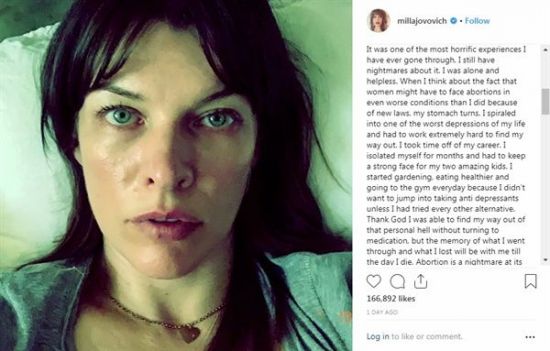 15일(현지시간) 미국 영화배우 밀라 요보비치는 자신의 인스타그램에 "낙태는 안전하고 위생적이지 않은 환경에서 수술을 받아야 할 뿐 아니라 여성으로서 감정적으로 매우 힘든 일이다"라며 "나도 2년 전에 긴급 낙태를 해야 했다"고 고백했다.