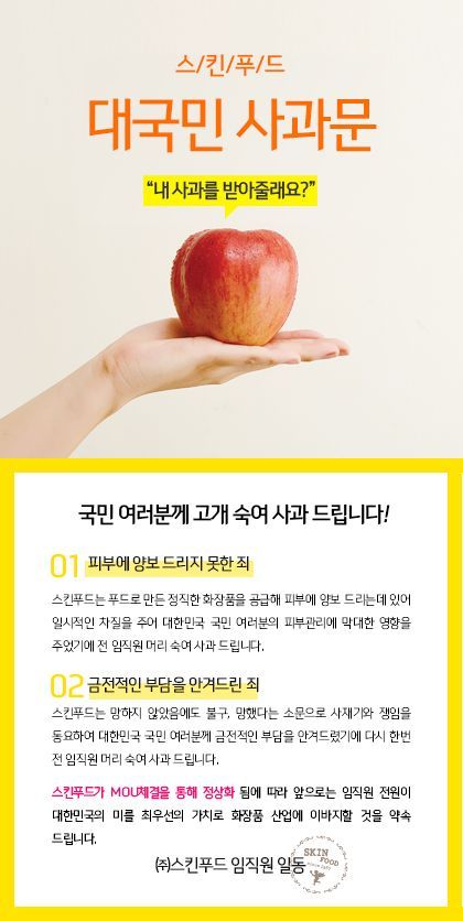 글에서 스킨푸드는 "피부에 양보 드리지 못한 죄, 사과드린다"며 "일시적인 차질을 주어 국민 여러분의 피부관리에 막대한 영향을 주었다"고 말했다.
