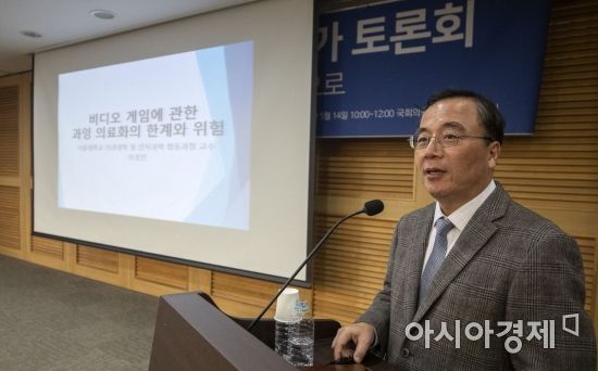 이경민 서울대학교 인지과학연구소 교수가 지난 14일 국회에서 열린 '게임이용, 어떻게 볼 것인가' 토론회에서 주제 발표를 하고 있다. 세계보건기구가 20~28일 열리는 세계보건총회에서 '게임 중독'을 질병으로 분류할 예정인 가운데 보건의료계와 게임 이용자, 관계 부처 등이 서로 다른 시각과 입장을 공유하고 대응 방향을 논의했다./윤동주 기자 doso7@