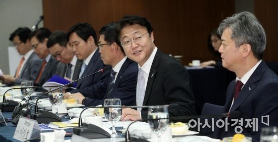 주형철 신남방특위 위원장(청와대 경제보좌관, 왼쪽 다섯 번쨰)이 21일 서울 중구 은행회관에서 열린 신남방정책특별위원회 제2차 금융권 간담회에서 참석자들과 대화하고 있다./김현민 기자 kimhyun81@