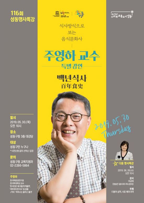 [아시아경제 박종일 기자] 성동구(구청장 정원오)가 30일 오전 10시 성동구청 3층 대강당에서 한국학중앙연구원 교수로 활동하고 있는 주영하 교수를 초청, 제116회 성동명사특강을 개최한다.
