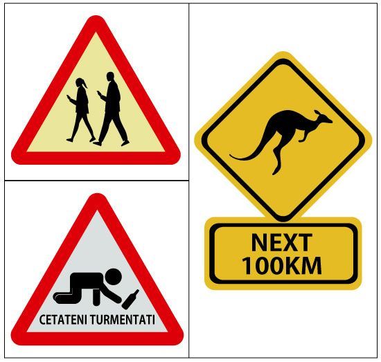 그 외에도 다양한 표지판이 있습니다. 낙석주의 표지판은 어느 나라에서나 흔하지요. 그러나 낙우(牛)주의 표지판(그림 오른쪽 아래)은 드뭅니다. 돌도 무섭지만 소가 떨어질 수도 있다고 운전자에게 주의하라는 신호를 보내는 도로라면 운전하기가 두려울 것 같습니다. '매춘부주의', '행상금지' 표지판 등도 있다고 합니다. 세상은 넓고 표지판은 다양합니다.