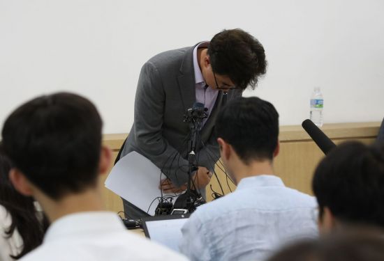 헝가리 부다페스트 다뉴브강에 29일(현지시간) 침몰한 유람선에는 '참좋은여행' 패키지 투어를 하던 한국인들이 탑승했던 것으로 확인됐다. 30일 오후 서울 중구 참좋은여행사에서 이상무 전무이사가 취재진에게 사고 관련 사항을 브리핑하며 고개 숙여 인사하고 있다. 사진=연합뉴스