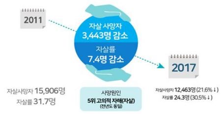 인구 10만명당 자살자 수를 의미하는 자살률은 2017년 24.3명으로 2016년(25.6명)보다 1.3명 감소했다. 자살자 수가 가장 많고 자살률이 제일 높았던 2011년(1만5906명, 31.7명)보다는 7.4명 감소했다.