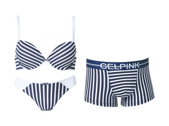이번 신제품은 스트라이프 패턴의 와이어 브라와 팬티, 커플 코디가 가능한 남성용 드로즈다.