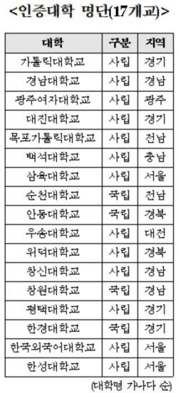 이 가운데 14개 대학은 '인증'을, 3개 대학은 '조건부인증'을 받았다.