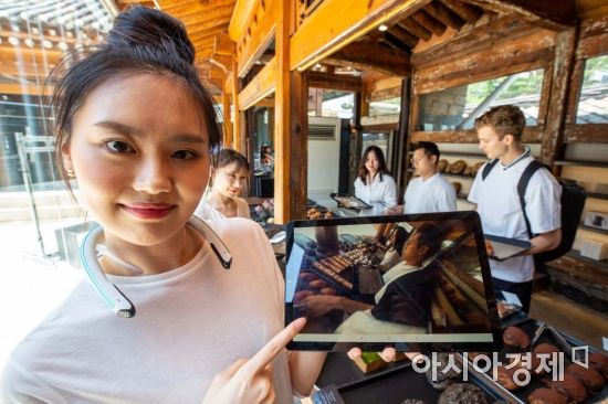 25일 서울 종로구 카페 어니언에서 홍보 모델이 KT '5G 웨어러블 360 카메라'를 선보이고 있다. KT가 이번에 선보인 FITT 360은 목에 거는 '넥밴드형' 카메라로 다른 360 카메라와 달리, 양 손이 자유로운 상태에서 촬영할 수 있는 세계 최초의 360 웨어러블 카메라다./강진형 기자aymsdream@