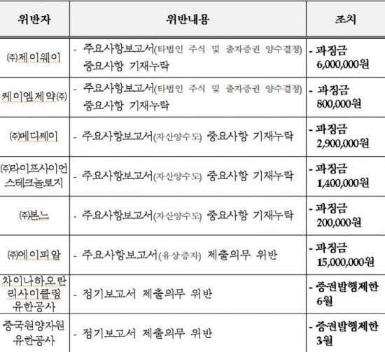 증선위는 자산양수도 사실을 공시하지 않은 코넥스 상장법인 메디쎄이와 라이프사이언스테크놀로지, 코스닥의 본느에 대해서도 각각 290만원, 140만원, 20만원씩 과징금을 부과했다.