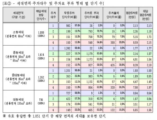 조사는 1대부터 4대까지 주차대수와 세대별 전용면적에 따라 일정 구간으로 나눠 이뤄졌으며 면적별 구분은 소형세대(60㎡ 이하), 중형세대(60㎡ 초과~85㎡ 이하), 중대형세대(85㎡ 초과~135㎡ 이하), 대형세대(135㎡ 초과)로 진행했다. 전체 1851단지 중 소형세대를 보유한 단지는 1008단지, 중형세대 1414단지, 중대형세대 1352단지, 대형세대는 736단지로 조사됐다.