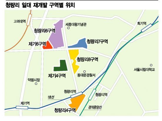 제기동 재개발 구역을 둘러싸고 있는 청량리 재개발도 모습을 드러내고 있다. 청량리6구역도 조합 설립인가를 받고 사업시행인가를 위한 사전작업에 착수했고 7구역은 현재 관리처분인가를 준비 중에 있다. 이밖에 6구역 대각선에 자리잡은 8구역은 현재 건축심의를 준비 중이다. 심의를 넘어서면 사업시행인가에 나서기로 했다.