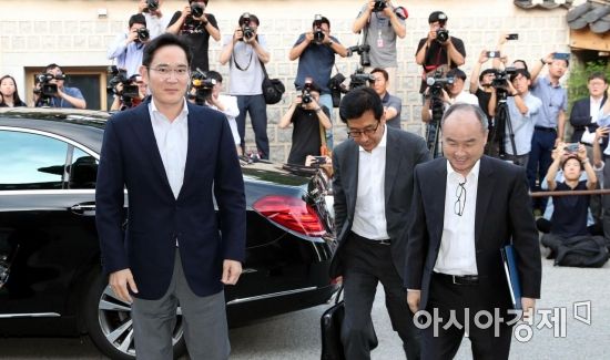 손정의 소프트뱅크 회장과 이재용 삼성전자 부회장이 4일 서울 성북동 한국가구박물관에 도착해 들어가고있다. 이날 이재용 삼성전자 부회장과 정의선 현대차 수석부회장, 구광모 ㈜LG 대표, 김택진 엔씨소프트 대표와 이해진 네이버 글로벌최고투자책임자(GIO)가 만났다./강진형 기자aymsdream@