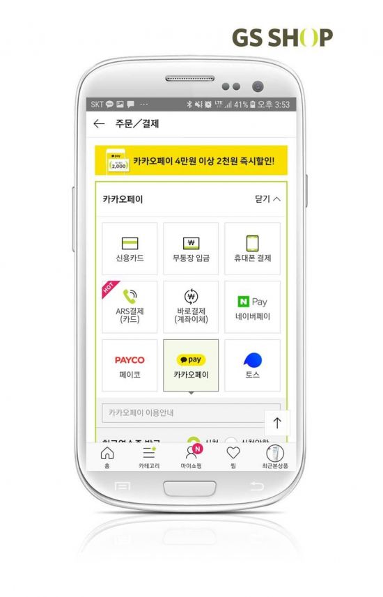 한편 GS샵은 카카오페이 도입을 기념, 이달 말까지 카카오페이를 통해 구매하는 고객을 대상으로 2000원 즉시할인(4만원 이상 구매 시)을 제공할 계획이다.
