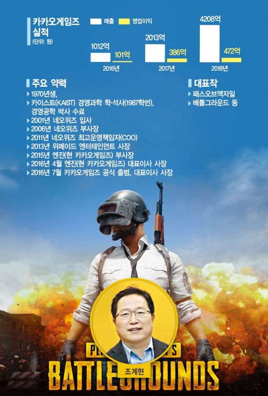◆연이은 게임 대박, 소비자층 간파 주효 = '대박' 게임을 발굴해 성공적인 서비스로 이끄는 조 대표 능력은 이미 정평이 나 있다. 과거 네오위즈에서도 퍼블리싱 부문에서 핵심 역할을 하며 야구 게임 '슬러거'를 발굴했고 '크로스파이어' 등 인기 게임의 해외 서비스를 주도하기도 했다. 카카오게임즈의 성장 과정 곳곳에도 국내 PC온라인 및 모바일 시장에서 영향력을 지속적으로 확대해온 조 대표의 역량이 배어 있다. 그것은 "완성도 높은 게임들을 최적의 타이밍에 시장에 선보여 게임의 특성과 트렌드에 맞춘 서비스로 성공 가능성을 높인다"는 말로 요약된다. 2017년 글로벌 신드롬을 불러 일으킬 정도로 화제가 된 게임 '배틀그라운드'의 국내 서비스를 맡은 것이 대표적이다. 이 게임은 현재까지도 우리나라 PC방 게임 순위 1~2위를 다툴 정도로 인기를 유지하고 있다.