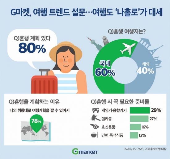 1일 G마켓이 최근 2주(7월15~28일) 동안 총 993명의 고객을 대상으로 '나홀로 여행'에 대한 설문조사를 실시한 결과, 전체 응답자 중 80%가 앞으로 혼행을 떠날 계획이 있는 것으로 조사됐다. 이미 혼행 경험이 있다고 답한 참여자도 61%에 달했다.