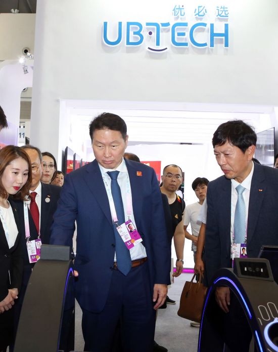 최태원 SK회장(가운데)이 26일 중국 충칭시 국제엑스포센터에서 열린 '2019 스마트 차이나 엑스포'에서 글로벌 IT 기업들의 전시관을 둘러보고 있다.