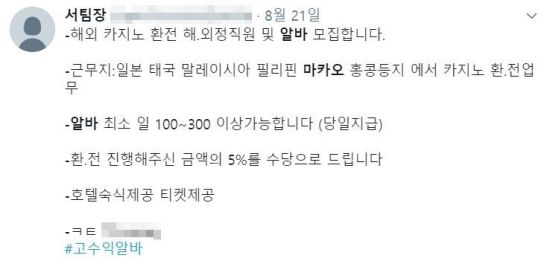 SNS에 올라와 있는 해외 카지노 환전 아르바이트 구인 광고. (사진=SNS 캡처)