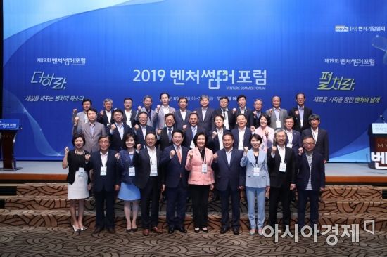 지난달 28일부터 30일까지 여수 엠블호텔에서 열린 '벤처썸머포럼'에서 이영남 노바스이지 대표(앞줄 왼쪽부터), 이병훈 광주광역시 부시장, 전현경 IT여성경제인협회 회장, 안건준 벤처기업협회 회장, 김영록 전라남도 도지사, 박영선 중소벤처기업부 장관, 이용주 국회의원, 박미경 한국여성벤처협회 회장, 정성인 한국벤처캐피탈협회 회장, 석종훈 대통령비서실 중소벤처비서관 등이 기념촬영을 하고 있다.