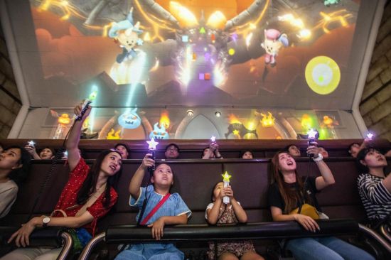 에버랜드가 국내 IT 강소기업들과 손잡고 개발한 '레니의 마법학교'를 찾은 고객들이 가상의 드래곤을 마법봉으로 공격하고 있다.