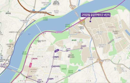 서울 강동구 강일동 대규모 택지개발지구로 한강변에 근접한 고덕강일지구 4단지는 학교 예정부지와 근린생활시설 등 편의시설 예정부지가 인접했다. 한강쪽으로 이어지는 녹지로 쾌적한 주거환경을 누릴 수 있다.