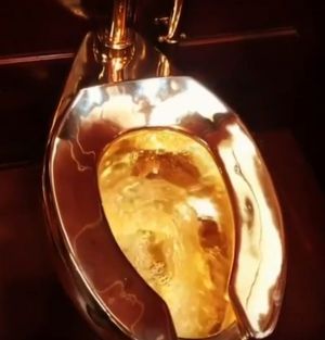 이 황금 변기는 이탈리아의 설치미술가 마우리치오 카텔란의 작품으로 도금된 금을 녹일 경우 최고 400만달러(약 47억7000만원)의 가치가 나오는 것으로 평가 받고 있다. 이 작품은 미국의 지나친 부에 대한 조롱과 풍자를 담고 있다. "200달러짜리 점심을 먹든 2달러 핫도그를 먹든 결과는 똑같다. 모두 변기로 간다"는 내용을 담고 있다.