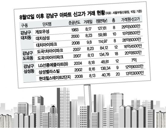 눈에 띄는 것은 대치ㆍ도곡ㆍ삼성동에서의 상승세다. 매매된 아파트의 절반 이상이 신고가를 기록했다. 대치동의 경우 이 기간 총 12건이 거래됐는데 7건이 사상 최고가에 팔렸다. 평형은 중소형에서 대형까지 고르게 분포했다. 1983년 준공된 재건축 아파트 '개포우성' 전용 127㎡(8층)는 정부 발표 닷새 뒤인 지난달 17일 29억5000만원, 대치삼성 97㎡(5층)와 59㎡(10층)는 같은 달 14일과 23일 각각 21억원, 15억8500만원에 새 주인을 찾았다. 강남권 신축(2015년 준공)에 속하는 래미안대치팰리스 94㎡(5층)와 84㎡(23층)는 지난달 15일과 27일 각각 29억2000만원, 27억7000만원의 신고가를 썼다. 대치아이파크 114㎡(8층)는 이달 8일 26억6000만원에 팔렸고, 래미안대치하이스턴 110㎡(11층)의 경우 지난달 14일 22억5000만원으로 준공 30년 이래 가장 높은 값에 매매됐다.