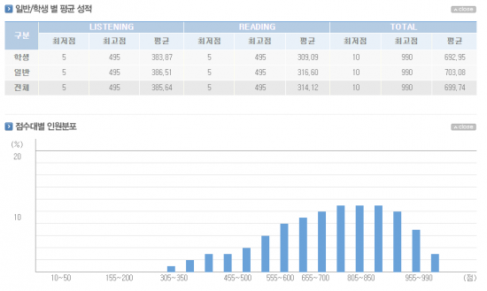 응시자들은 RC 평균 314.12점, LC 평균 385.64점을 기록한 것으로 나타났다.