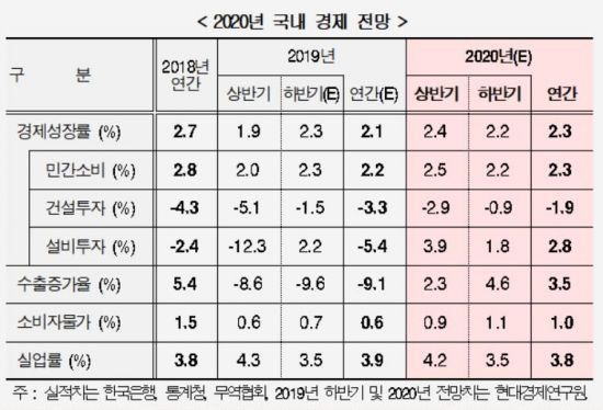 연구원은 22일 '2020년 한국 경제 전망' 보고서를 내고 내년에도 부진한 내수 경기 흐름 및 수출 경기의 미약한 회복 등이 이어질 것이라고 밝혔다.