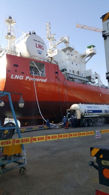 LNG추진선 그린아이리스호에 탱크로리를 통해 LNG를 공급하고 있다.