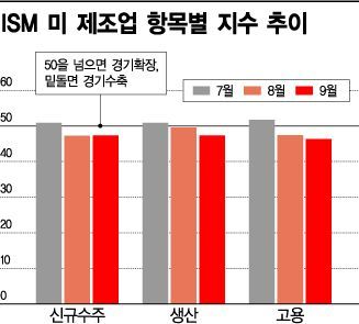 그럼에도 전문가들이 주목하는 이유는 무역 전쟁이 길어지고 해결될 기미도 보이지 않고 있어서다. 특히 무역 전쟁이 제조업 침체를 유발하고, 불안정성이 커진 기업들이 투자와 고용을 줄이는 결과를 낳는다는 점이 문제다. 세부 항목별 ISM 지수를 보면 경기선행지표 성격이 짙은 ISM 신규수주지수는 지난 8월(47.2)에 이어 9월에도 47.3을 기록했고, 생산과 고용지수도 줄줄이 하락하고 있다. 미 싱크탱크 피터슨국제경제연구소의 채드 바운 선임연구원은 "도널드 트럼프 미 대통령의 잘못된 정책을 따르는 대신 기업들은 그저 투자를 미루거나 상황을 지켜보기만 할 수 있다"며 불확실성이 침체를 초래할 수 있다고 내다봤다.