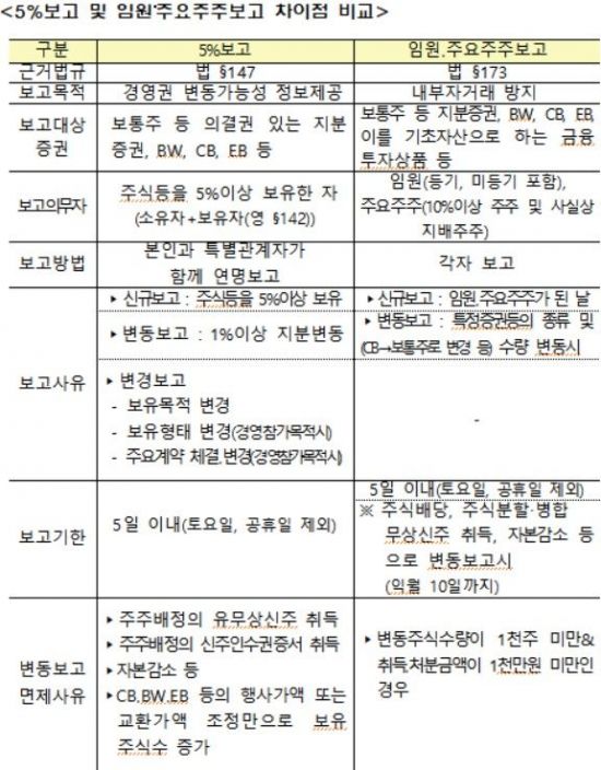 5%룰 보고 의무는 지지 않아도 임원·주요주주 보고는 해야 하는 경우도 있다. 주주배정의 신주인수권증서를 얻을 때 수량이 1000주 이상이거나 취득·처분금액이 1000만원 이상이면 임원·주요주주보고는 해야 한다. 주식분할·병합 시엔 지분율은 그대로라도 수량은 바뀌기 때문에 임원·주요주주 공시 의무가 발생한다.