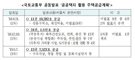 서울시와 국토부는 '수도권 30만가구 공급'을 목표로 3차에 걸친 공급계획을 발표했다. 47곳(3만2000)은 서울 지역에 공급되는 물량이다. 서울시는 2차 공급계획 발표 직후인 지난해 말 '주택 8만가구 추가공급 계획'을 발표, 1·2차 발표 부지인 35곳(2만5000가구)을 2022년 착공을 목표로 추진한다고 밝힌 바 있다. 올해 5월 발표한 3차 발표 부지는 구의자양 재정비촉진1구역(1363가구), 창동역 창업·문화산업단지(200가구) 등 13곳(7523가구)이다.