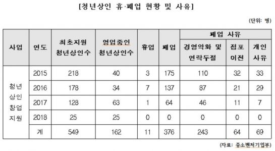 영업을 유지하고 있는 285개 점포 가운데 처음부터 이 사업의 지원을 받은 청년상인이 그대로 영업을 하고 있는 점포는 162개에 불과하다. 전체 지원 점포의 29.5%에 그쳤다. 특히 청년상인 창업지원을 받은 청년상인의 폐업 사유를 보면, '경영악화 및 연락두절'이 243명으로 가장 많았다. '개인사유' 69명, '점포이전' 64명 등의 순이었다.