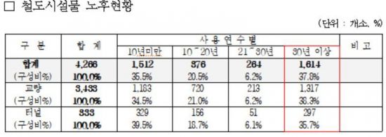 30년 이상 된 철도교량은 1317개, 철도터널은 297개로 각각 전체의 38.3%와 35.7%를 기록했다. 노후 교량은 경부선(246곳)이, 노후 터널은 중앙선(55개)이 가장 많았다.